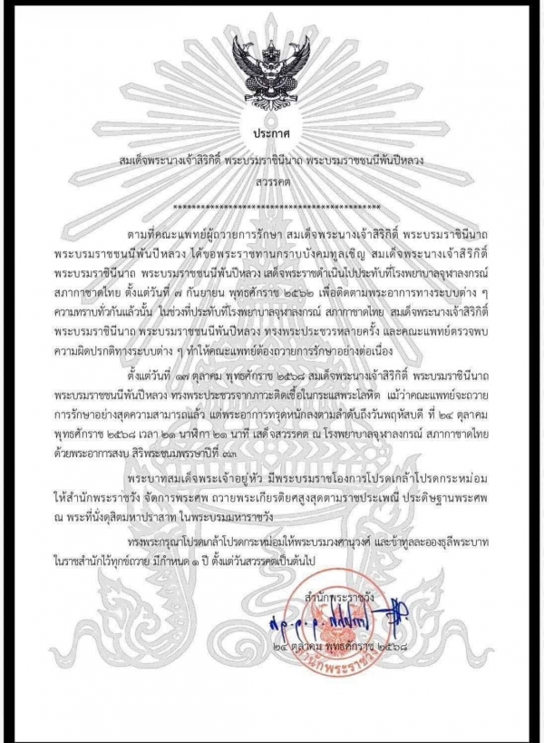 สำนักพระราชวัง เผยแพร่ประกาศ สมเด็จพระนางเจ้าสิริกิติ์ พระบรมราชินีนาถ พระบรมราชชนนีพันปีหลวง สวรรคต