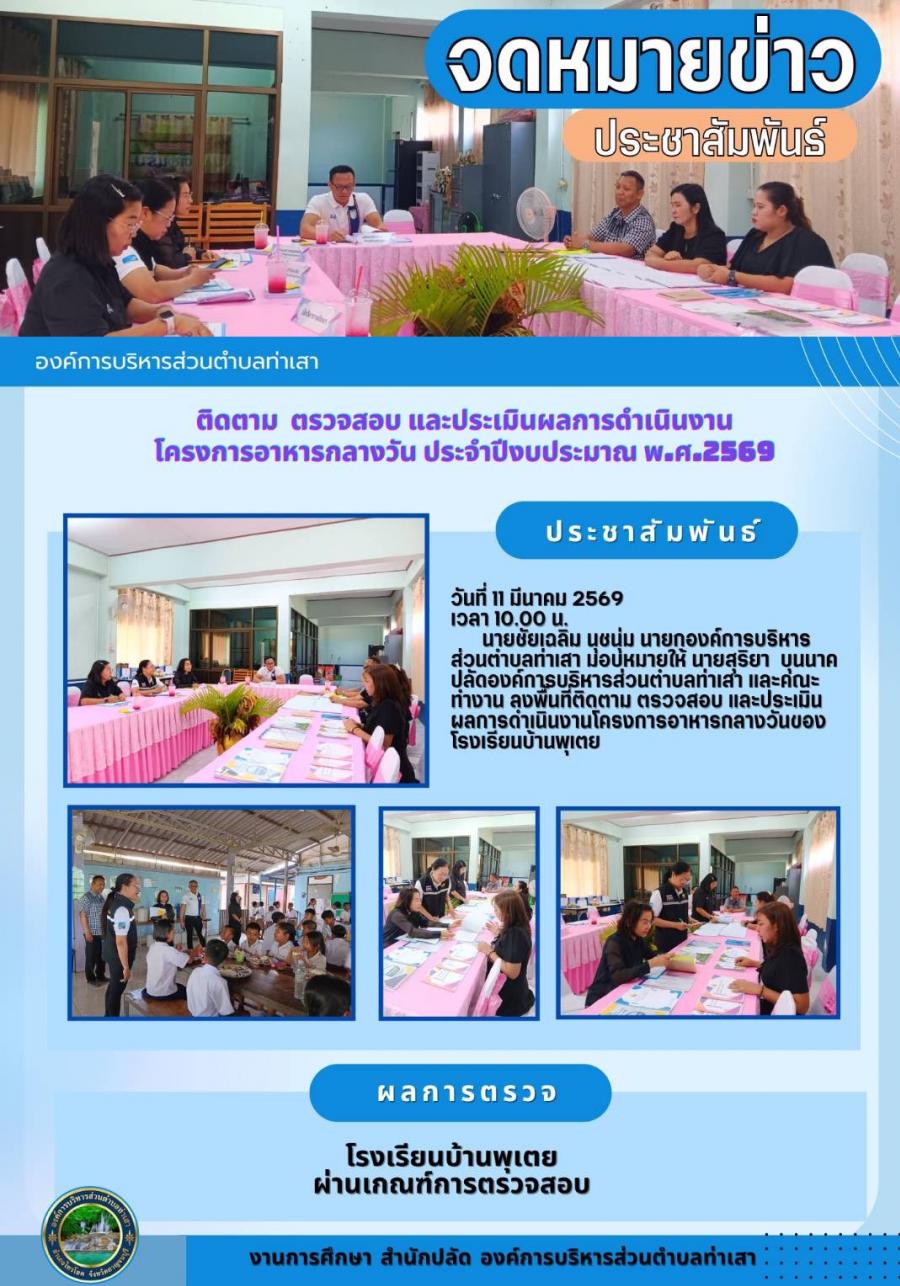 นายชัยเฉลิม นุชนุ่ม นายกองค์การบริหารส่วนตำบลท่าเสา มอบหมายให้ นายสุริยา บุนนาค ปลัดองค์การบริหารส่วนตำบลท่าเสา และคณะทำงาน ลงพื้นที่ติดตาม ตรวจสอบ และประเมินผลการดำเนินการโครงการอาหารกลางวันของโรงเรียนบ้านพุเตย ผลการตรวจ โรงเรียนบ้านพุเตยผ่านเกณฑ์การตรวจสอบ