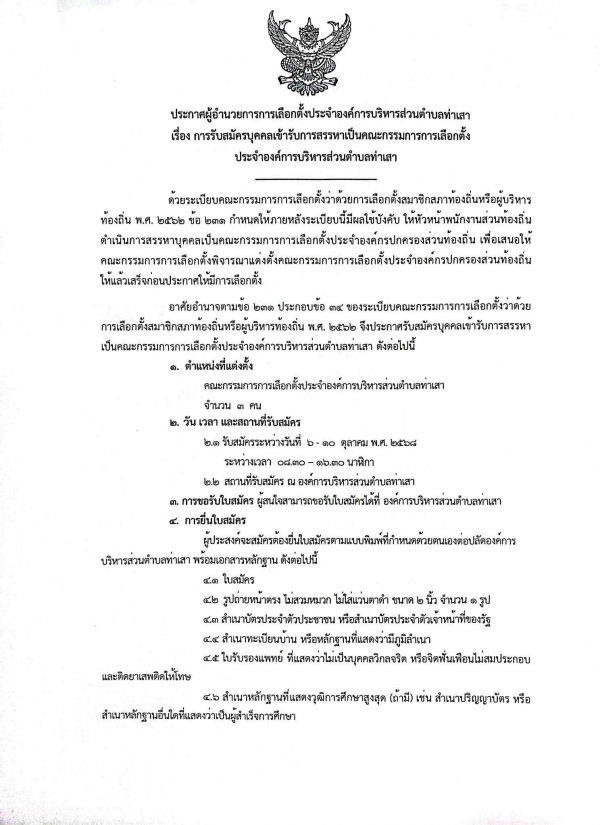 การรับสมัครบุคคลเข้ารับการสรรหาเป็นคณะกรรมการการเลือกตั้งประจำองค์การบริหารส่วนตำบลท่าเสา