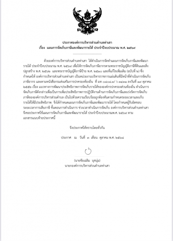 ประกาศองค์การบริหารส่วนตำบลท่าเสา เรื่อง แผนการจัดเก็บภาษีและพัฒนารายได้ ประจำปีงบประมาณ พ.ศ. 2569